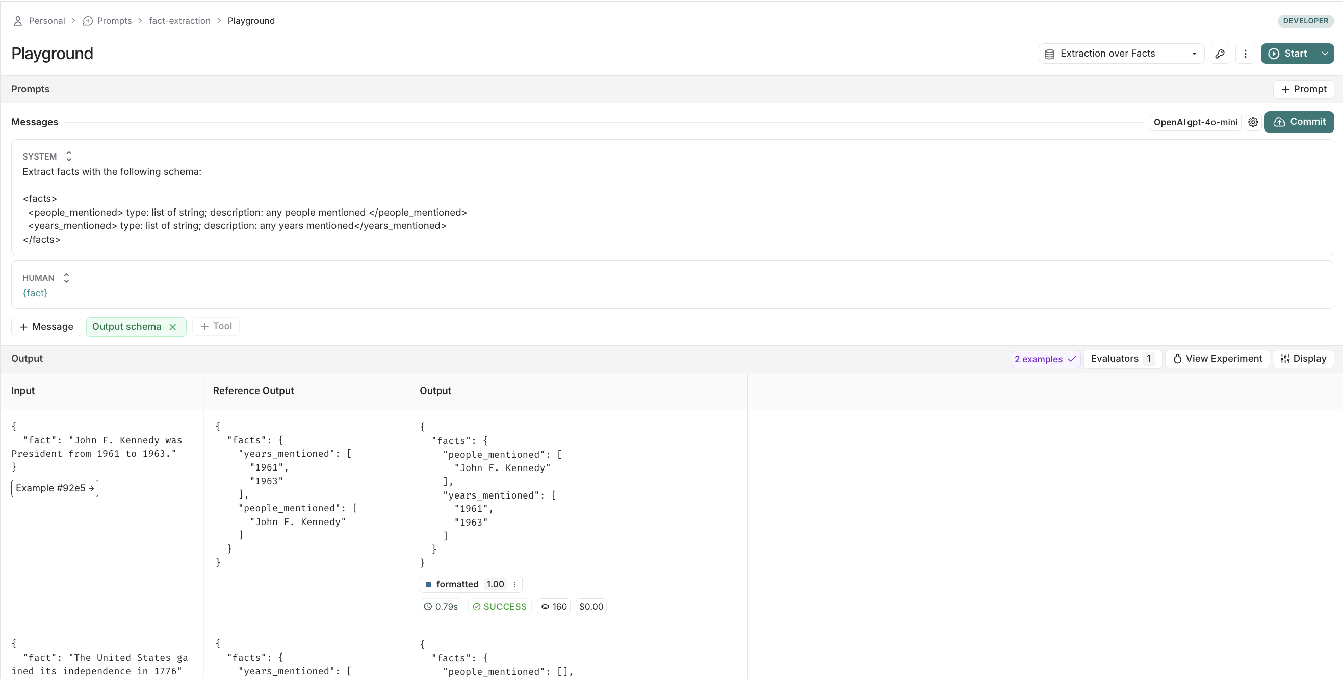 On the dataset, if you now click to the experiments tab -> + Experiment -> Run in Playground, you can see the results in action. Your runs in your experiments will be automatically marked with the key specified in your code sample above (here, formatted):